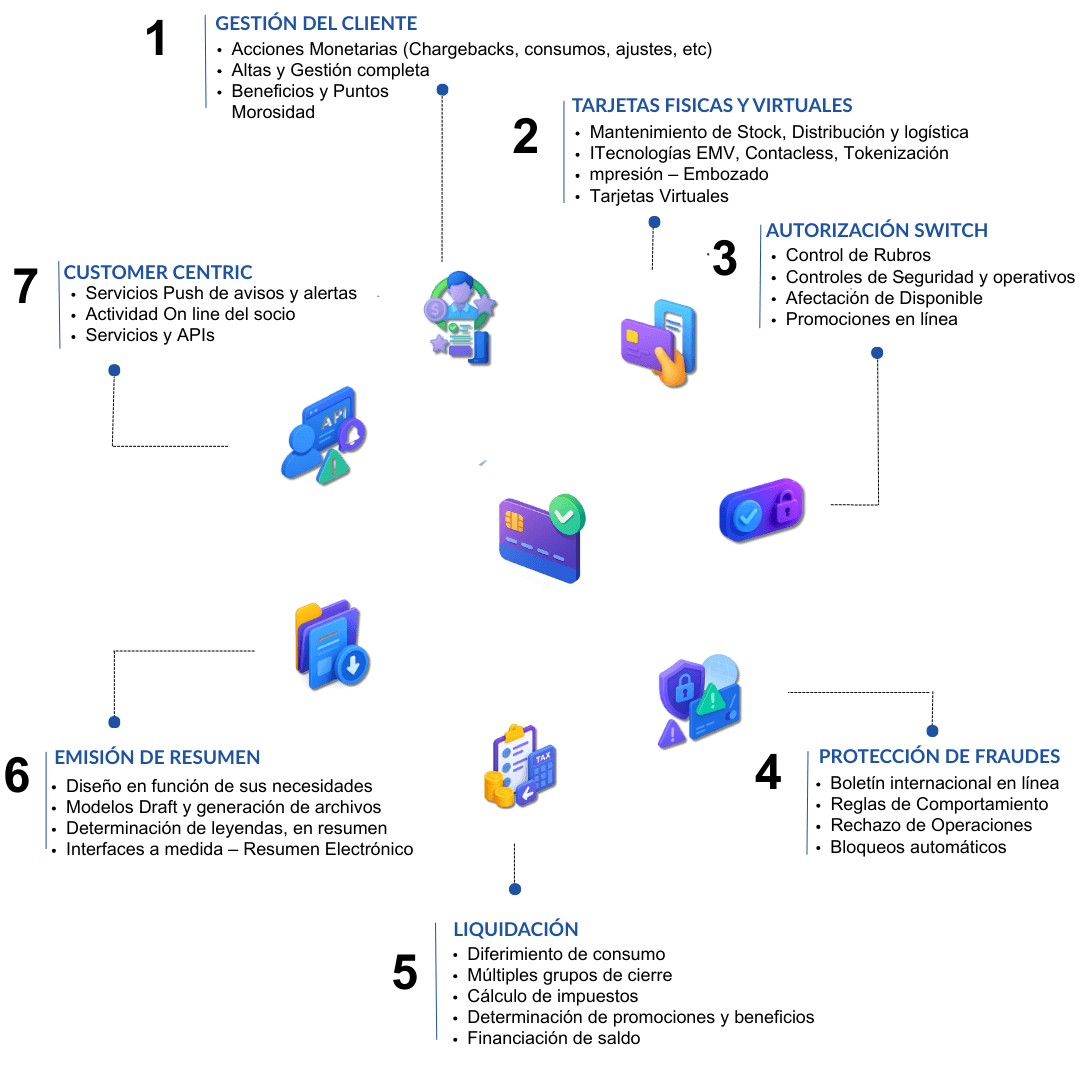Soporta tarjetas nominadas e innominadas, duales y multimoneda, adaptándose a distintos modelos de negocio. Ofrece control de saldos en tiempo real, límites operativos personalizados, programas de incentivos, diferimiento de consumos y múltiples grupos de cierre.