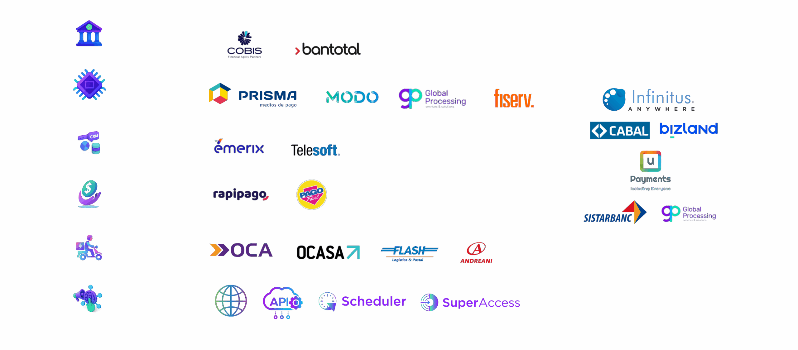 Integra sistemas propios con procesadoras, adquirentes y redes, estandarizando circuitos críticos como altas, liquidaciones, promociones, plásticos y contabilidad, funcionando como un core de tarjetas que gobierna toda la información.